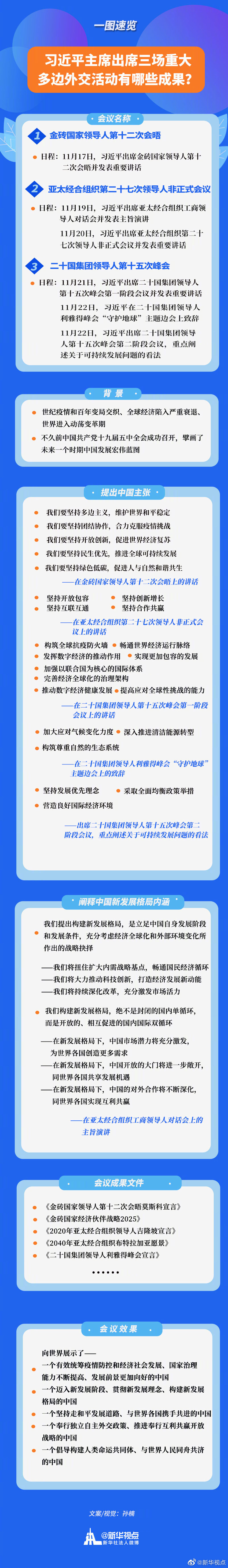 11月17日至22日,國家主席習(xí)近平接連出席金磚國家領(lǐng)導(dǎo)人第十二次會晤、亞太經(jīng)合組織第二十七次領(lǐng)導(dǎo)人非正式會議、二十國集團(tuán)領(lǐng)導(dǎo)人第十五次峰會三場重大多邊外交活動,并發(fā)表一系列重要講話。習(xí)主席的講話有哪些要點(diǎn)?提出了哪些中國主張?是如何闡釋中國新發(fā)展格局內(nèi)涵的?戳圖速覽↓