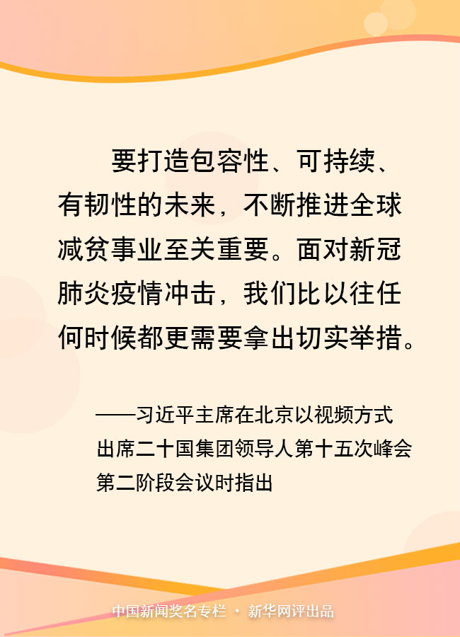 11月22日晚,習(xí)近平主席在北京以視頻方式出席二十國集團(tuán)領(lǐng)導(dǎo)人第十五次峰會(huì)第二階段會(huì)議,重點(diǎn)闡述關(guān)于可持續(xù)發(fā)展問題的看法。他指出,要打造包容性、可持續(xù)、有韌性的未來,不斷推進(jìn)全球減貧事業(yè)至關(guān)重要。面對新冠肺炎疫情沖擊,我們比以往任何時(shí)候都更需要拿出切實(shí)舉措。