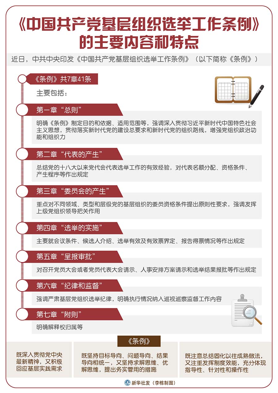 答:《條例》共7章41條,主要包括:第一章“總則”,明確《條例》制定目的和依據(jù)、適用范圍等,強(qiáng)調(diào)深入貫徹習(xí)近平新時(shí)代中國特色社會(huì)主義思想,貫徹落實(shí)新時(shí)代黨的建設(shè)總要求和新時(shí)代黨的組織路線,增強(qiáng)黨組織政治功能和組織力。第二章“代表的產(chǎn)生”,總結(jié)黨的十八大以來黨代會(huì)代表選舉工作的有效經(jīng)驗(yàn),對代表名額分配、資格條件、產(chǎn)生程序等作出規(guī)定。第三章“委員會(huì)的產(chǎn)生”,重點(diǎn)對不同領(lǐng)域、類型和層級黨的基層組織的委員資格條件提出原則性要求,強(qiáng)調(diào)發(fā)揮上級黨組織領(lǐng)導(dǎo)把關(guān)作用。第四章“選舉的實(shí)施”,主要就會(huì)議條件、候選人介紹、選舉有效及有效票界定、報(bào)告得票情況等作出規(guī)定。第五章“呈報(bào)審批”,對召開黨員大會(huì)或者黨員代表大會(huì)請示、人事安排方案請示和選舉結(jié)果報(bào)批等作出規(guī)定。第六章“紀(jì)律和監(jiān)督”,強(qiáng)調(diào)嚴(yán)肅基層黨組織選舉紀(jì)律,明確執(zhí)行情況納入巡視巡察監(jiān)督工作內(nèi)容。第七章“附則”,明確解釋權(quán)歸屬等。