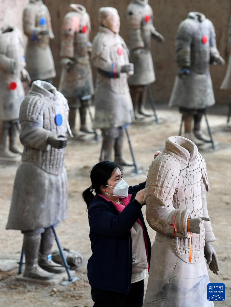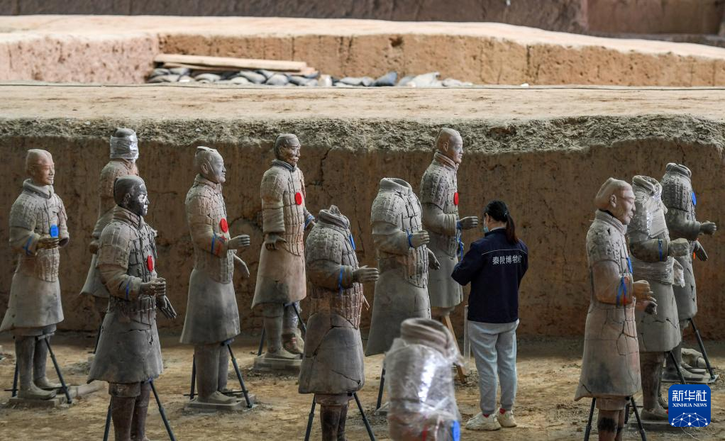 工作人员在秦兵马俑一号坑遗址进行秦俑修复(4月26日摄)。