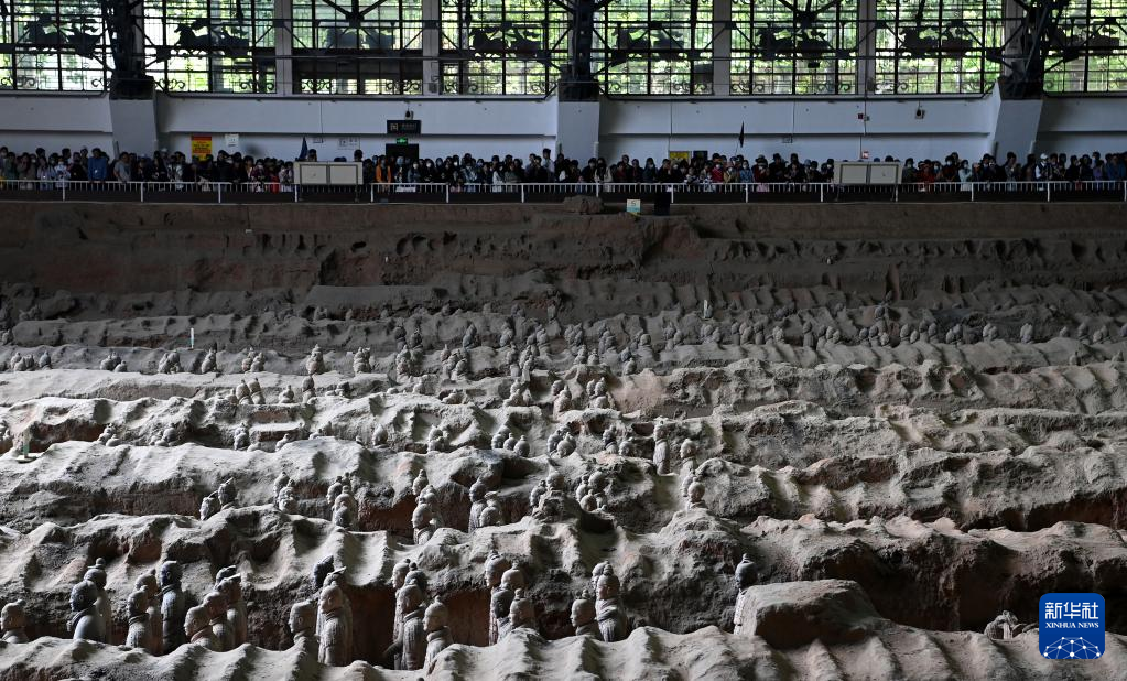 游客在秦兵马俑一号坑遗址参观(4月26日摄)。