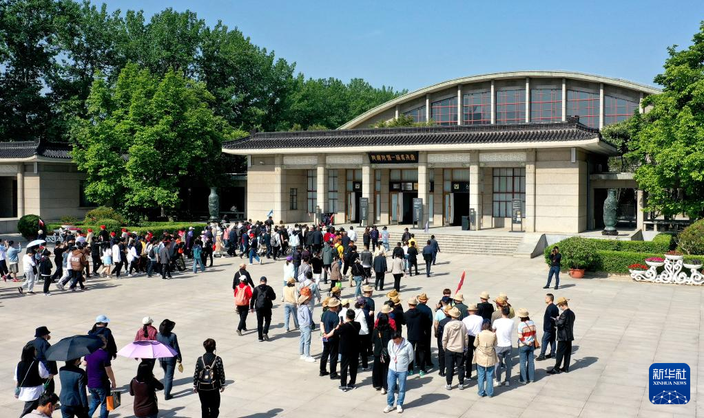 游客前往秦兵马俑一号坑遗址参观(4月26日摄,无人机照片)。
