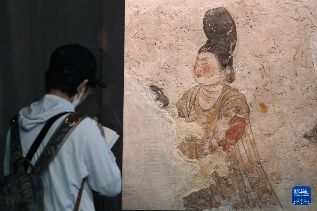 5月11日,游客在陕西历史博物馆唐代壁画珍品馆内参观绘制于懿德太子墓的《阙楼仪仗图》。