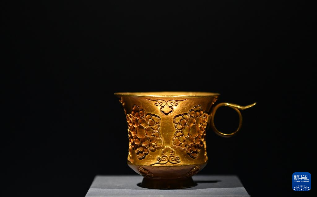 这是在陕西历史博物馆拍摄的掐丝团花纹金杯(5月11日摄)。唐代带把杯除部分器物直接来自中亚粟特,还有部分属于唐人仿制粟特风格的作品,这些物品都是东西方文明通过丝绸之路进行交流互鉴的的珍贵物证。