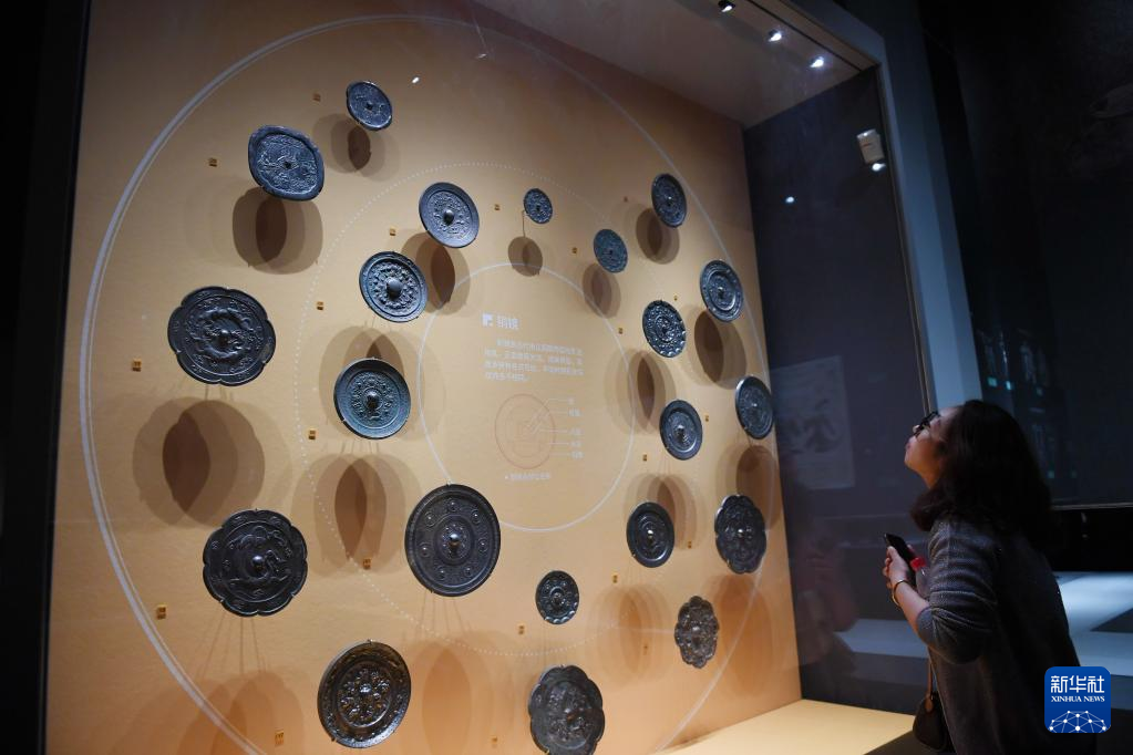 5月8日,游客在西安博物院参观展出的铜镜。