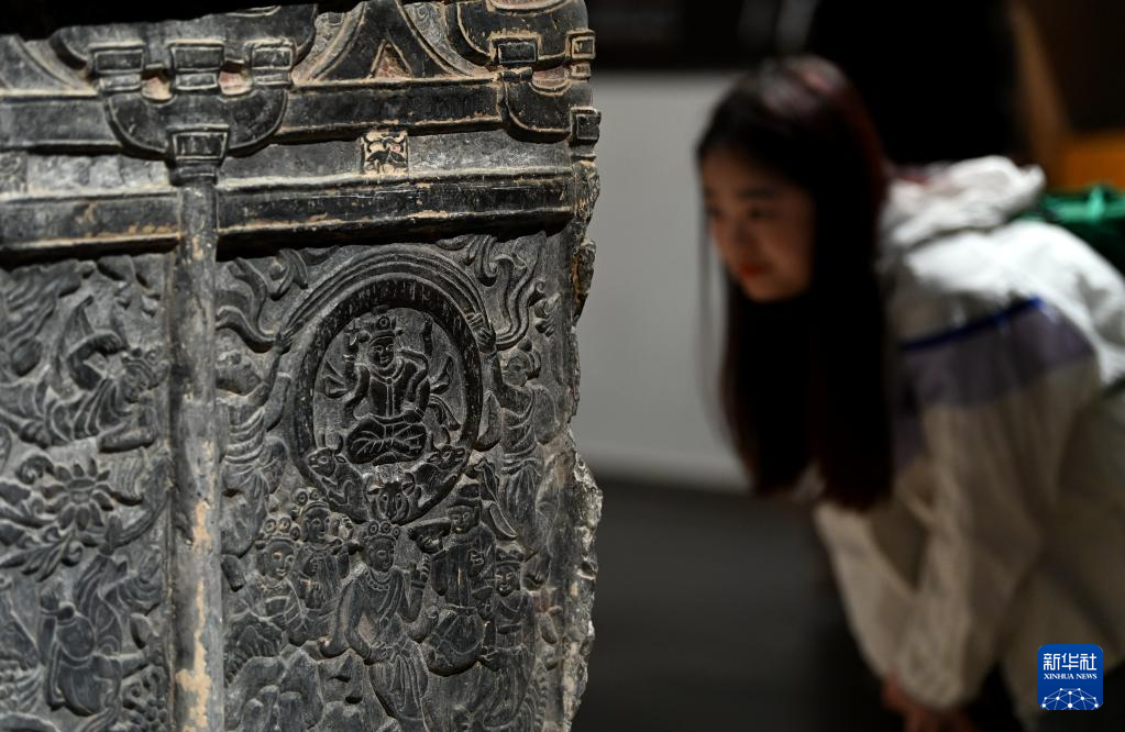 5月8日,游客在西安博物院参观史君墓石椁。墓主史君是北周凉州萨保,粟特人。石椁整体为中国传统歇山顶殿堂式建筑,四壁浮雕内容和风格则带有鲜明的西域特色。