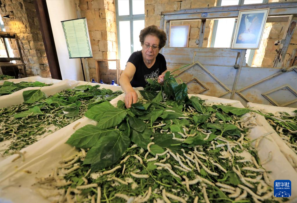 5月17日,在黎巴嫩卜苏斯丝绸博物馆,工作人员用桑叶喂蚕。
