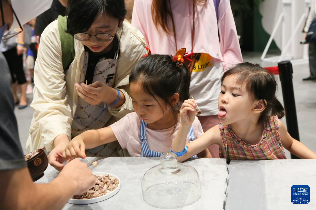 7月21日晚,小朋友在夜间“那达慕”大会上品尝美食。