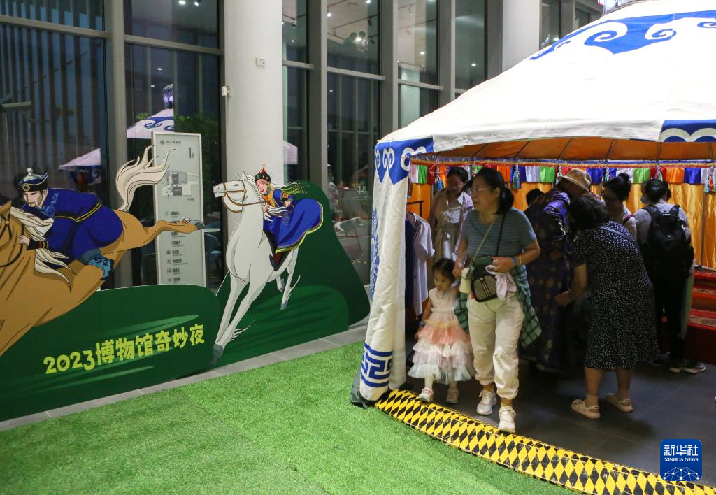 当日,为配合“漠北锋鸣——鄂尔多斯青铜器文物精品展”,助力城市夜经济发展,上海市闵行区博物馆开展夜间“那达慕”大会。参观者可以体验射箭、拔河,品尝特色美食,充分感受民俗风情的魅力。