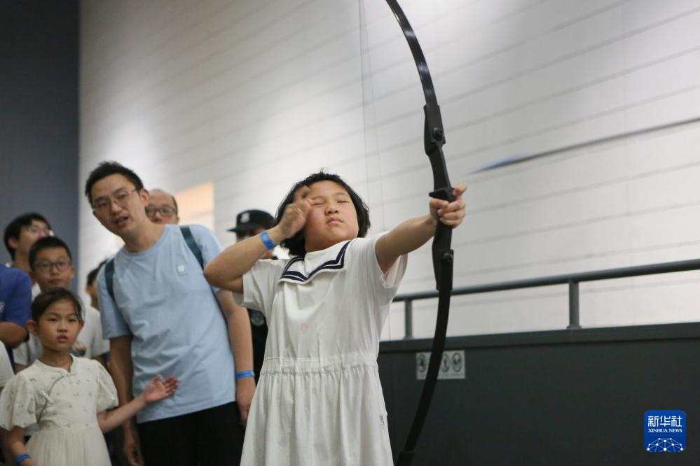 7月21日晚,小朋友在夜间“那达慕”大会上体验射箭。
