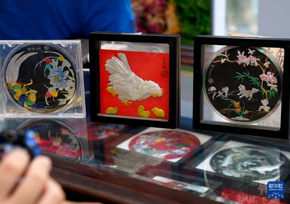 艺术节现场展示的用易拉罐创作的环保手工作品(8月15日摄)。