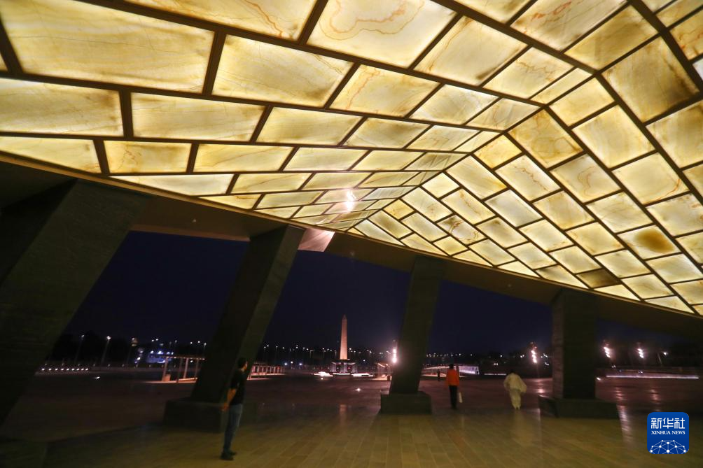 这是10月8日在埃及吉萨省拍摄的晚上亮灯的大埃及博物馆。