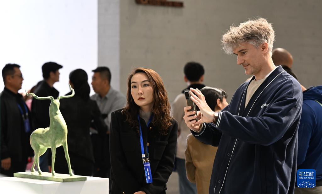 10月14日,观众在首届呼和浩特国际雕塑艺术展上观赏雕塑作品。