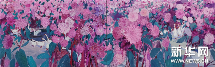 李江峰《大丽花丛戏大鹅》 98x290cm 2023年