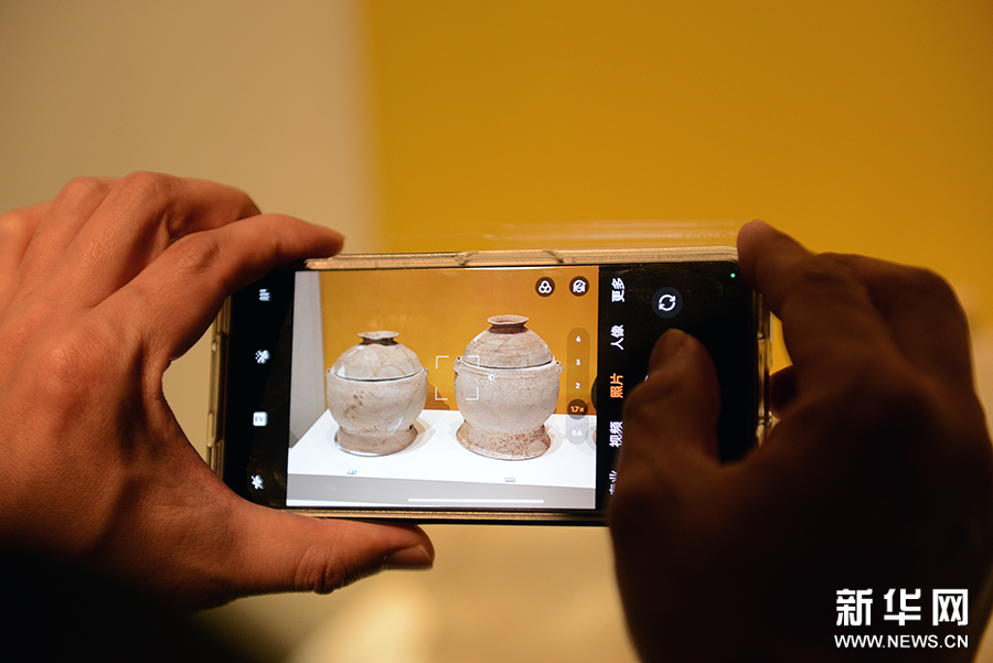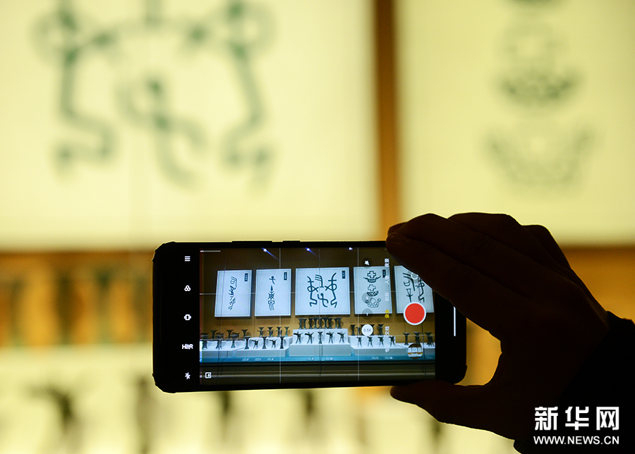 2月26日,河南省安阳市殷墟博物馆新馆,游客在拍摄展品。