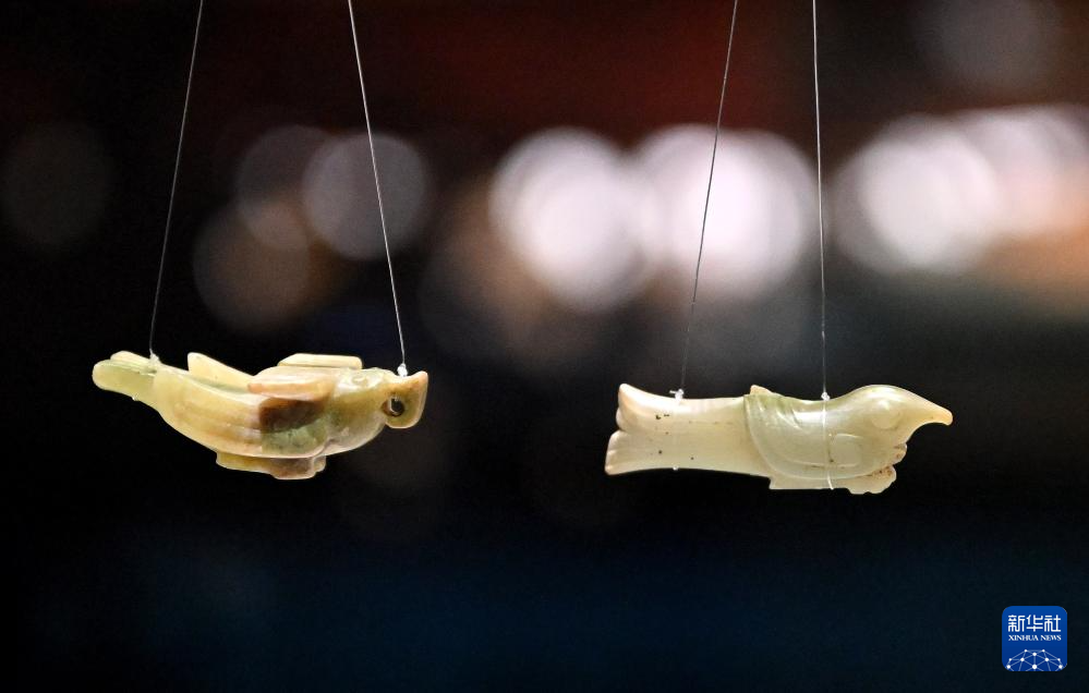 河南安阳殷墟博物馆新馆内展出的玉鸟(2月26日摄)。