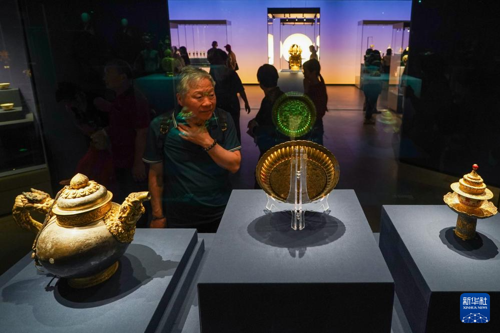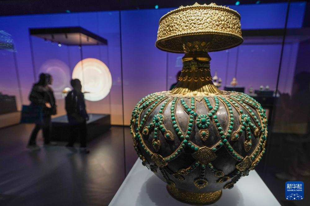 5月11日,“布达拉宫——来自雪域的世界文化遗产”展览现场展出的“银质嵌松石璎珞尊胜瓶”。