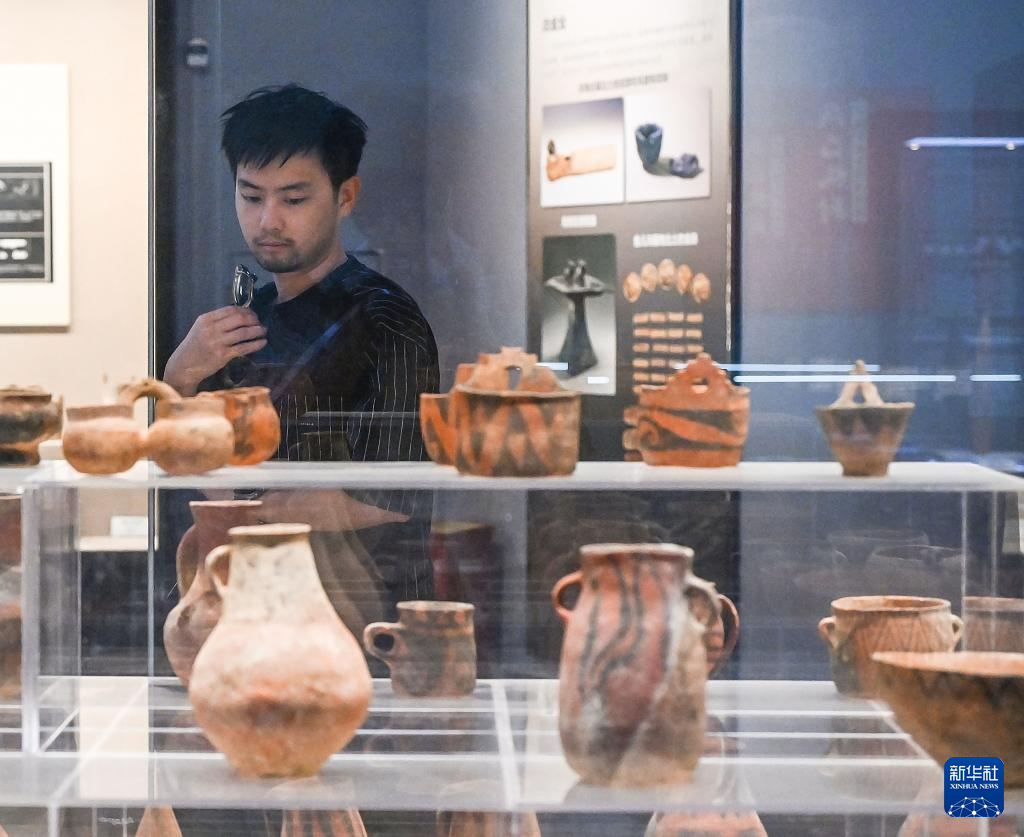 5月14日,游客在吐鲁番博物馆通史展厅观看彩陶罐。