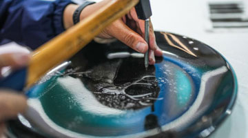 5月18日,在甘肃省定西市安定区博物馆,学生在陶罐上绘图。