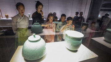 7月7日,在新疆克州阿图什市新时代文明实践中心,学生参观作品展览。