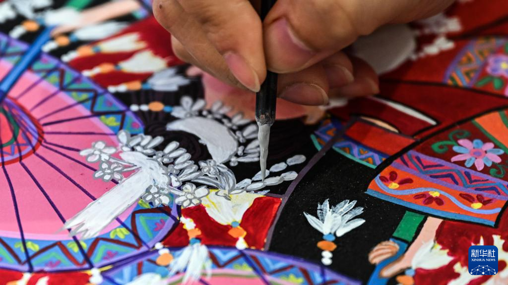 9月11日,侗族农民画代表荣雪莲在创作农民画。