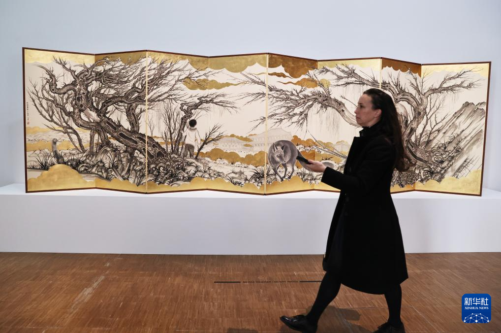10月8日,媒体记者在法国巴黎蓬皮杜中心参观中国当代艺术家群展《目:中国境象》。