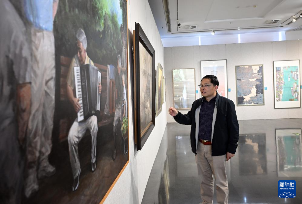 10月15日,策展人谭国亮介绍展出的画作。