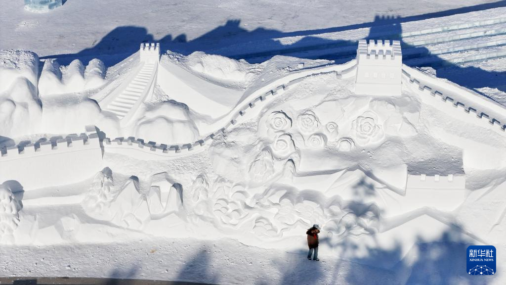 12月23日,雕刻师在哈尔滨太阳岛雪博会园区创作大型雪雕(无人机照片)。