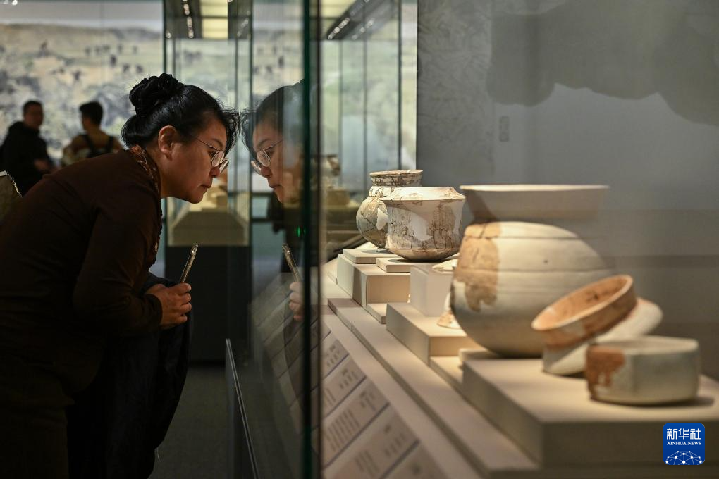 1月21日,参观者在“万古长歌——湖南史前文明图卷展”上观看陶器。