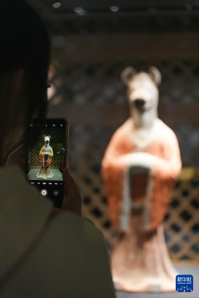 1月21日,观众在“聚宝之盆——新疆文物珍品展”拍摄猪首人身俑(复制品)。