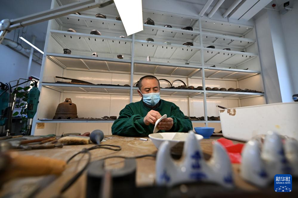4月15日,在云冈研究院可移动文物修复室,工作人员刘铨义在进行瓷器修复。