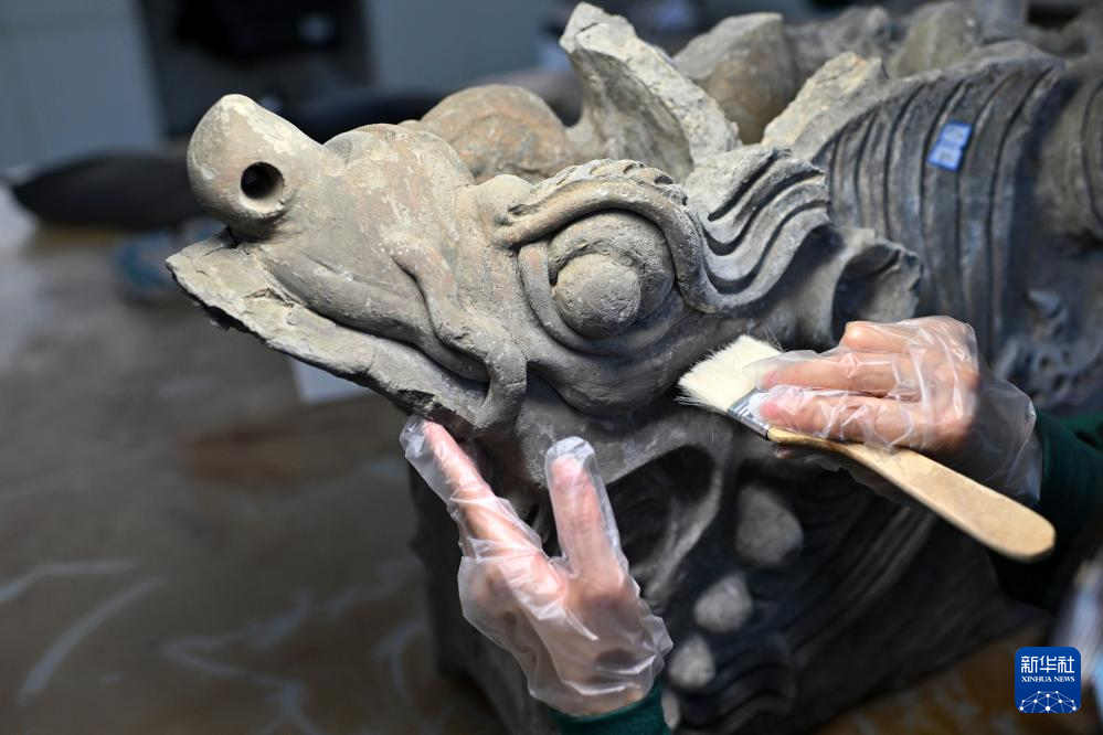 4月15日,在云冈研究院可移动文物修复室,工作人员在进行除尘作业。