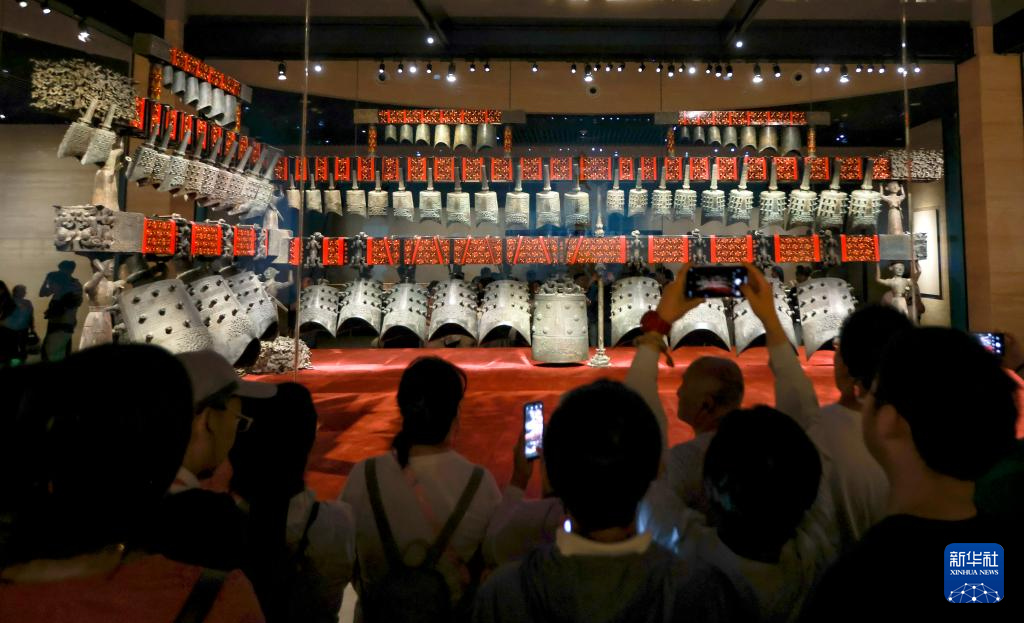 5月18日,观众在湖北省博物馆内参观编钟文物。