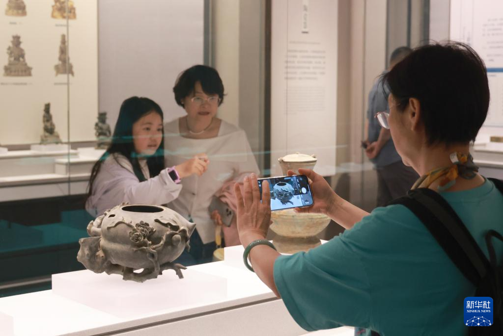 5月18日,小朋友和家长在浙江省余姚博物馆参观西晋越窑青釉黄鼬把瓷鸡首壶。