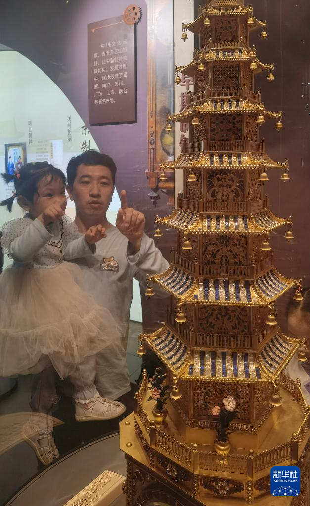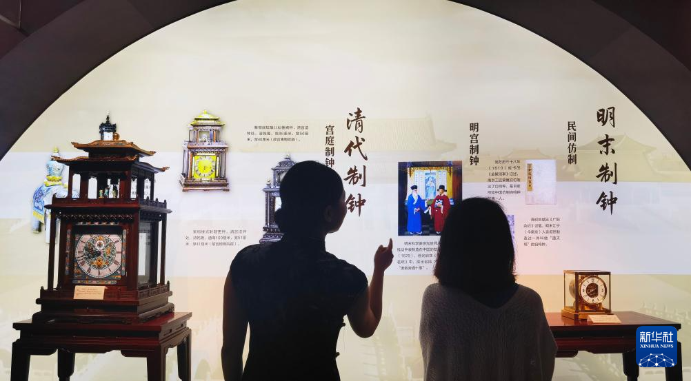 5月17日,游客在船山钟表博物馆内观看18世纪英国为中国清朝宫廷设计制作的“九耀金钟”。