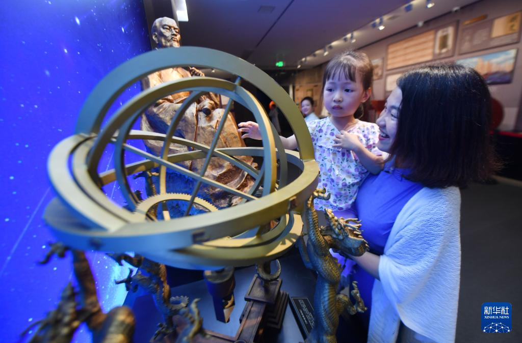 5月17日,游客在船山钟表博物馆内参观“水运浑天仪”模型。