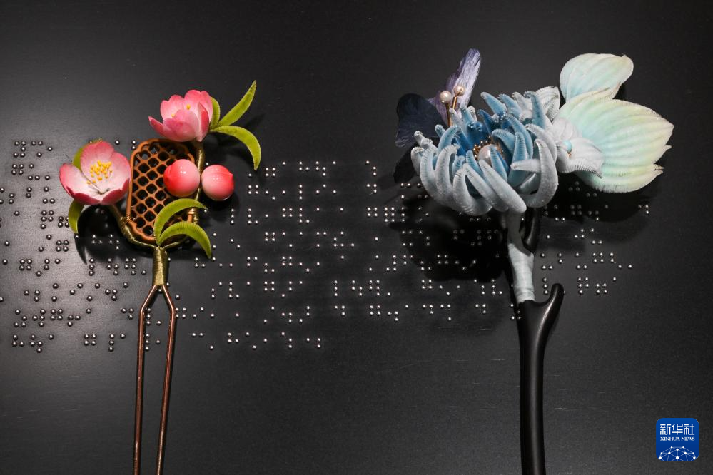 这是故宫博物院和四川省残联联名文创产品——春桃发簪(左)和蝴蝶戏菊发簪(5月17日摄)。