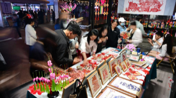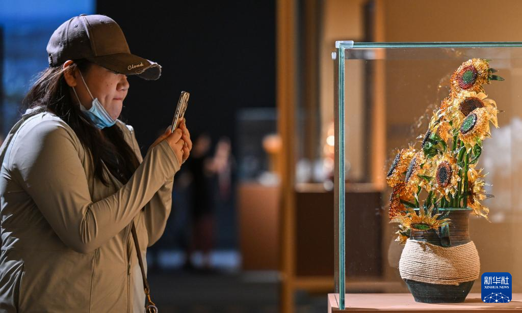 6月10日,参观者在拍摄一件名为“暖光里的葵语”的参展琉璃作品。