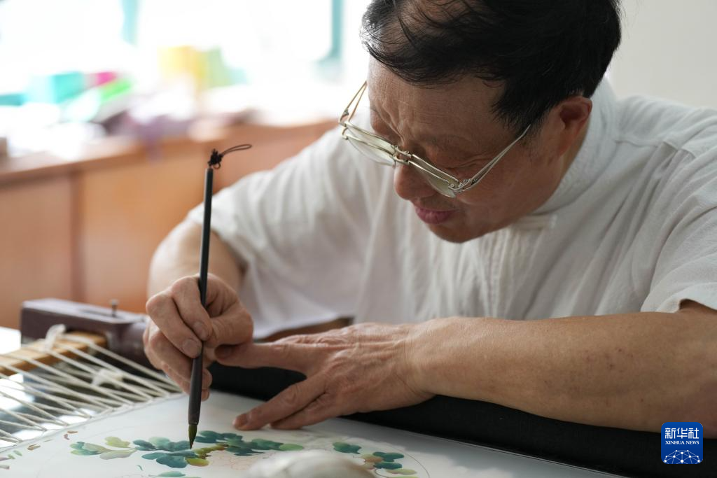 6月6日,在东台嘉丽发绣厂,东台发绣传承人陈伯余工作前擦拭眼镜。