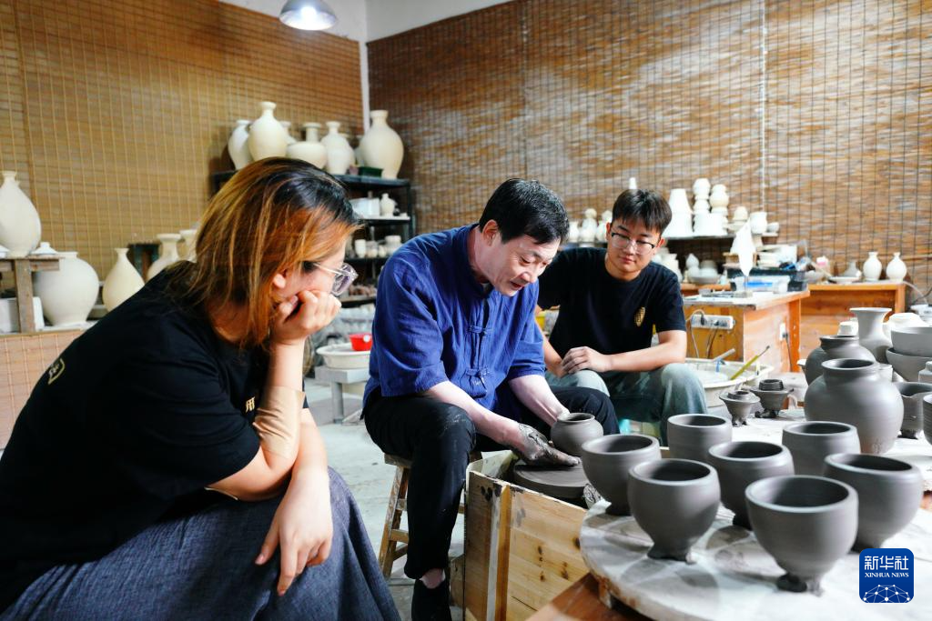 6月28日,张志忠(中)在给学生讲解瓷器制作技巧。