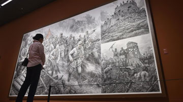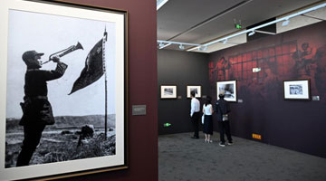 9月1日,参观者在艺术展上展出的抗战主题摄影作品前驻足观看。