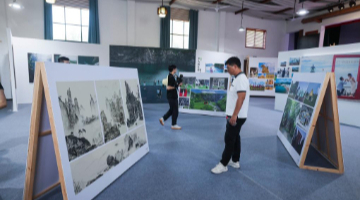 9月1日,参观者在艺术展上展出的摄影作品前驻足观看。