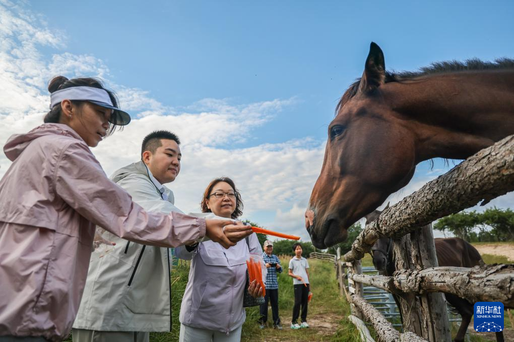 8月17日,王剑书在河北承德御道口草原体验喂动物。