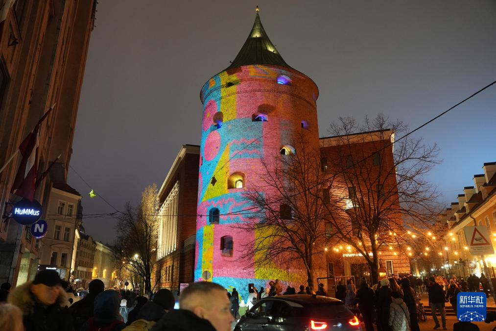 11月17日,民众在拉脱维亚首都里加举行的灯光节上欣赏被照亮的火药塔。