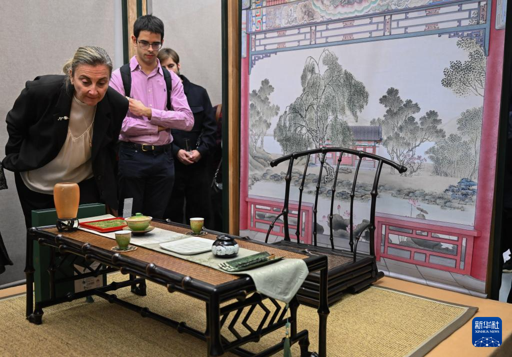 12月16日,在西班牙马德里中国文化中心,参观者在“安善萃锦——中式生活美学展”上参观。