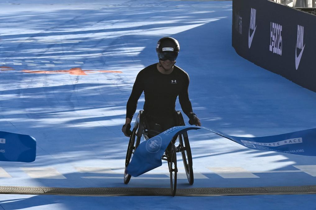 11月30日,罗兴传在比赛中冲向终点。最终,他获得竞速轮椅男子组冠军。新华社记者 陈浩明 摄