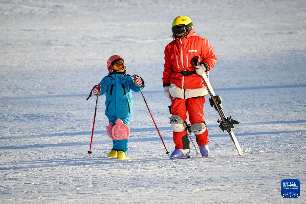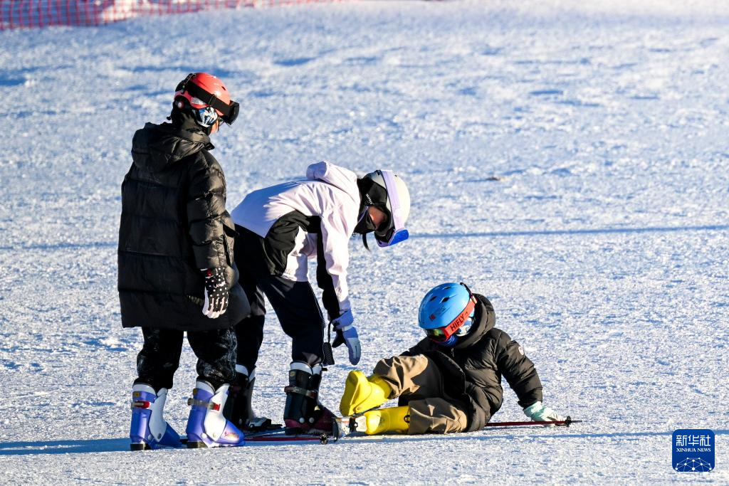 12月7日,滑雪爱好者带领小朋友滑雪。