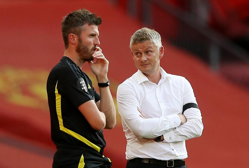 2020年6月24日,曼联队时任主教练索尔斯克亚(右)与助理教练卡里克在场边交流。当日,在2019-2020赛季英格兰足球超级联赛第31轮比赛中,曼联队主场以3比0战胜谢菲尔德联队。新华社/路透