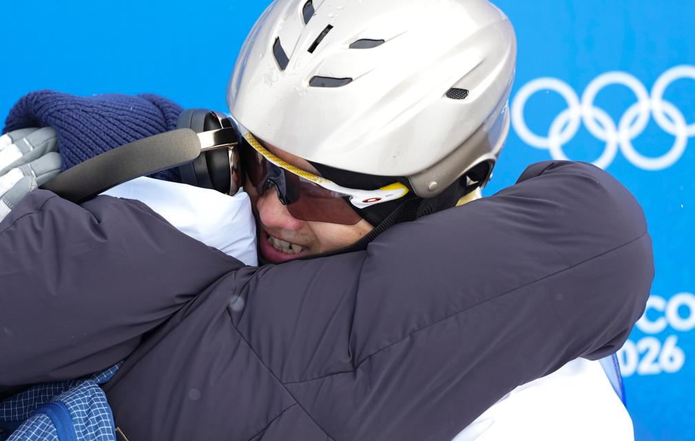2月20日,王心迪(右)和妻子徐梦桃在比赛中拥抱。在意大利利维尼奥举行的米兰-科尔蒂纳冬奥会自由式滑雪男子空中技巧决赛中,中国选手王心迪和李天马分获冠军和季军。新华社记者 邬惠我 摄