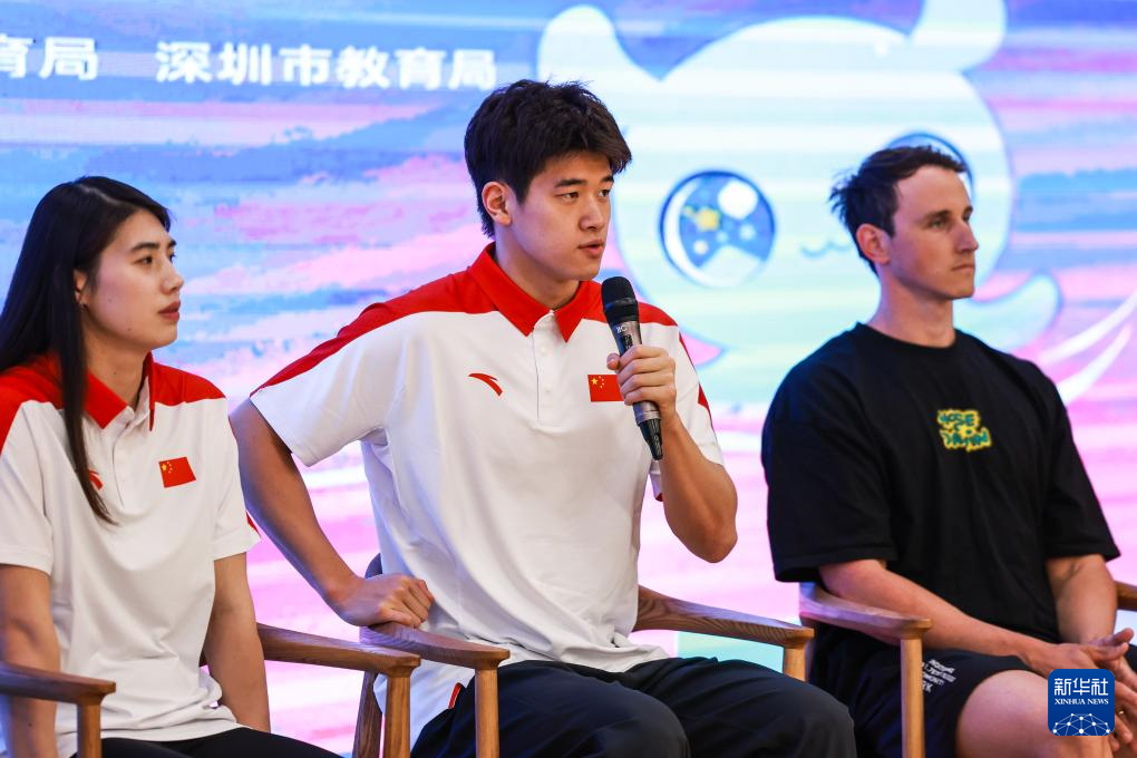 3月18日,中国游泳运动员潘展乐(中)在活动中回答学生提问。